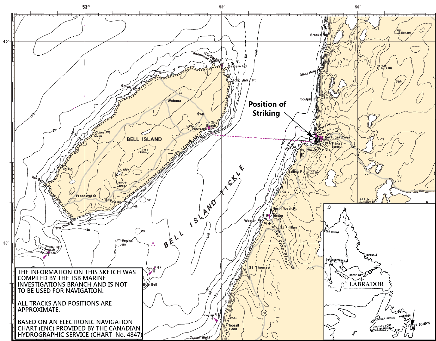 On 30 May 2012, the Beaumont Hamel, loaded with vehicles and passengers, was approaching Portugal Cove when both generator sets tripped offline, causing the vessel to black out approximately 50 m from the wharf. An electrical instability and fuel imbalance had been noted earlier; however, it is not known if these irregularities contributed to the simultaneous trip. There was insufficient time to restart the engine in order to regain immediate propulsion and steering, and as a result, the vessel struck the wharf. Although the post-occurrence electrical report indicated that the most likely cause of the blackout on 30 May was radio interference, the investigation did not conclusively determine the cause(s) of the repeated blackouts.
