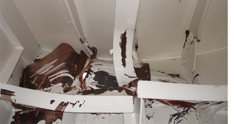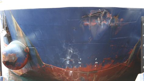 - A section of hull plating, approximately 2 m², was dented and sheared at the top of the indentation, 100 cm below the forecastle deck elevation (Photo 2).
