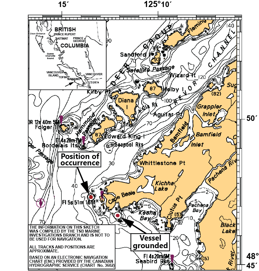 In the afternoon of 04 May 2012, after the crew had hauled the prawn gear on board, the vessel immediately departed Trevor Channel for more productive fishing grounds. The catch and wet prawn gear were retained on board, increasing the vessel’s topside weight. Coupled with the vessel’s loaded condition, the catch and prawn gear reduced the freeboard, which was already limited due to the vessel’s modifications. As the vessel exited Trevor Channel, travelling close to Cape Beale, it encountered heavier sea conditions due to the prevailing southwest swell against the ebbing tide. The master adjusted the vessel’s speed several times in reaction to the vessel’s slow roll, attempting to reduce the effects of the sea.