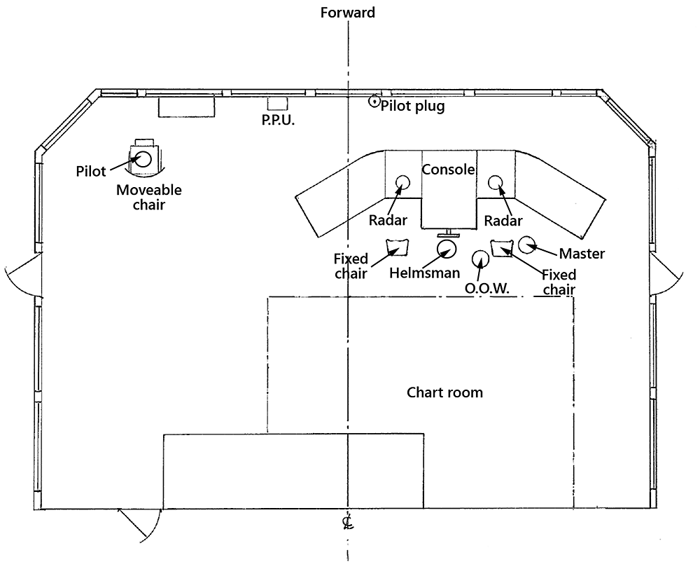 The bridge console is located slightly starboard of the vessel's centreline and consists of a conning position, engine controls, and 2 fixed chairs (Appendix A). The navigation chart table and Global Maritime Distress Safety System station are located aft of the bridge console. The bridge is equipped with the required navigational equipment, including 3 cm and 10 cm radars located in front of both the port and starboard fixed chairs.