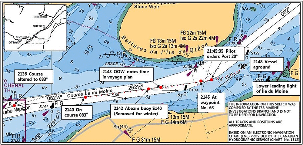 At 2145:20, the helmsman stated that the wheel was at starboard 20° and that the vessel was not responding to helm. The pilot abruptly asked for clarification, and the helmsman repeated that he could not steer. The pilot stood up and went to the middle of the wheelhouse to look out the bridge front window. Although there had been no change to the engine control setting, by 2145:35, the vessel's speed had reduced to 12.9 knots. At this time, the pilot ordered the rudder 20° to port. The helmsman repeated and executed the order, but the vessel did not turn in response to the rudder action. The pilot then ordered hard to port. The helmsman carried out the order, but the vessel's response was minimal. Approximately 30 seconds later, the vessel's heading was 071°T and its speed was 11.5 knots. The pilot ordered a course of 050°T and then ordered the wheel amidship. At 2148, the vessel was aground in position 46°04.0′ N, 073°02.17′ W (Figure 1). Immediately following the grounding, the pilot ordered full astern to the OOW, who executed the manoeuvre. The engine action had no effect and the vessel remained aground. The pilot then contacted MCTS Québec to report the grounding.