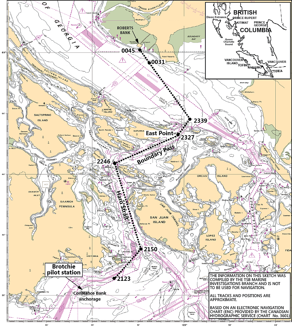 After the pilot boarded the vessel at 2102, he and the master exchanged information about the intended berthing manoeuvre at Westshore Terminals berth 2, which entailed the tugs joining the vessel outside the basin, making a starboard turn, entering the basin and then using tugs to turn the vessel off the berth. The master-pilot exchange card and the pilot card were completed and signed by both the master and pilot. Following the master-pilot exchange, the pilot set up his portable pilotage unit (PPU) in order to monitor the vessel's progress. The vessel continued its voyage, passing East Point at 2327 and exiting Boundary Pass at 2335. During the passage, the port anchor was prepared for use in case of an emergency.