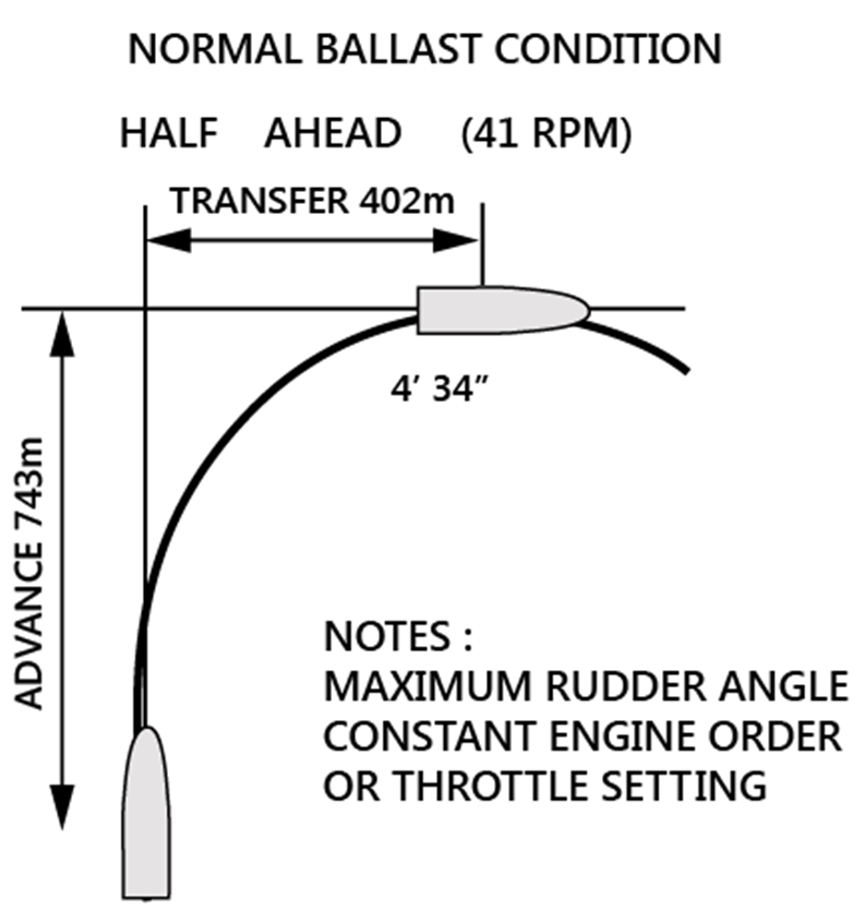 The vessel's manoeuvring information on the bridge indicated that, for a starboard turn made under normal ballast conditions with maximum rudder angle and the engine half ahead (41 revolutions per minute), the vessel's advance would be 743 m (or 4.0 cables) and the transfer would be 402 m at 90° heading change (Figure 2).