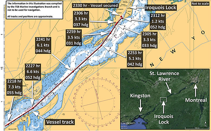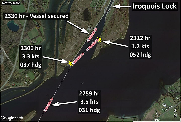 - The vessel was not slowed down by any means, such as dredging the anchor or using the main engine, and it struck the upper approach wall of the Iroquois Lock.