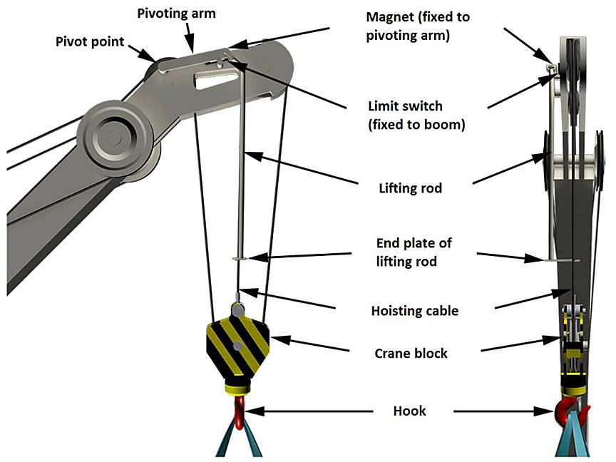 Most cranes are equipped by the manufacturer with limit switches. On the port provision crane, the hoisting winch (used to raise and lower the hoisting cable) was driven by an electric motor that was connected to a limit switch. This limit switch was located on the boom head (Figure 1) and worked in conjunction with a magnet on the pivoting arm to prevent the crane block from making contact with the boom head and potentially overstressing the hoisting cable.