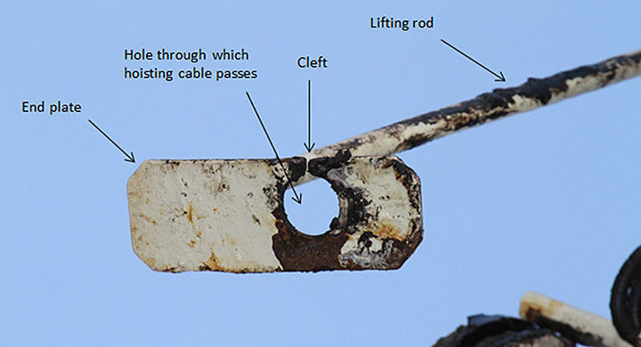 Following the occurrence, the lifting rod was found to be structurally intact. There was grease visible on the rod itself, but minimal grease visible on the end plate. Between the hole through which the hoisting cable was to pass and the outer edge of the end plate, there was a cleft that was approximately 10 mm wide (Photo 2).