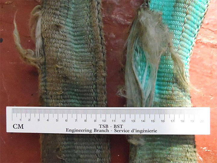 At the time of the occurrence, the basket was attached to the hook of the port provision crane by means of 2 nylon slings that were approximately 4.2 m in length. The slings were secured to the basket by 4 shackles. A post-occurrence examination found that the nylon slings were worn (Photo 4) and that the working load limit was marked on 2 out of the 4 shackles. None of the threaded pins on the 4 shackles were moused.Footnote 16