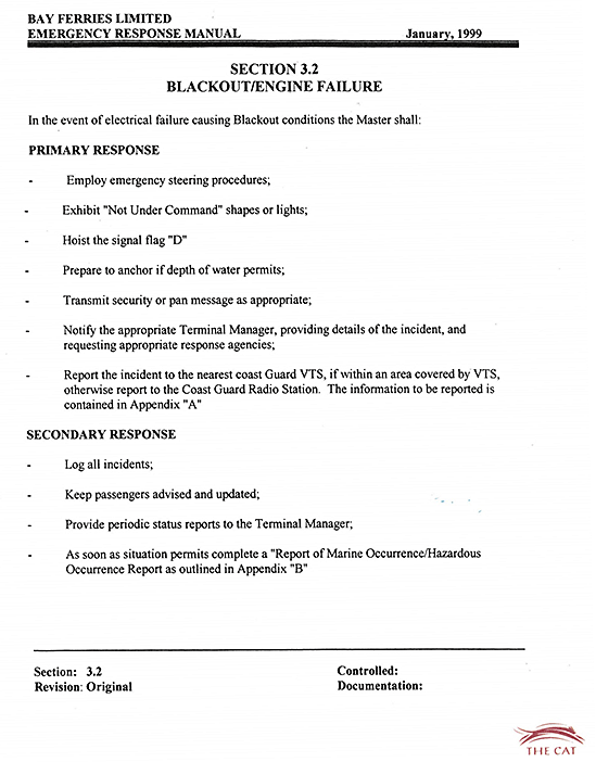 The on-scene commander checklist for blackout/engine failure contained primary and secondary steps to take to respond to a blackout emergency. Although a primary response is to exhibit “not under command” shapes or lights, the checklist did not indicate why the master may be unable to command the movements of the vessel (i.e., that pitch control is lost when the CPP pumps stop operating and that the propeller pitch is designed to default to full astern until power was restored to the main switch board and the CPP pumps were restarted). The checklist did not give any direction to the master that the vessel's propulsion may need to be unclutched or stopped if the bridge no longer has control of propeller pitch and the vessel's movements are standing the vessel into danger. The checklist also did not indicate a need to sound the emergency alarm when the main switchboard blacked out, even though the vessel would then begin operating on the emergency generator.