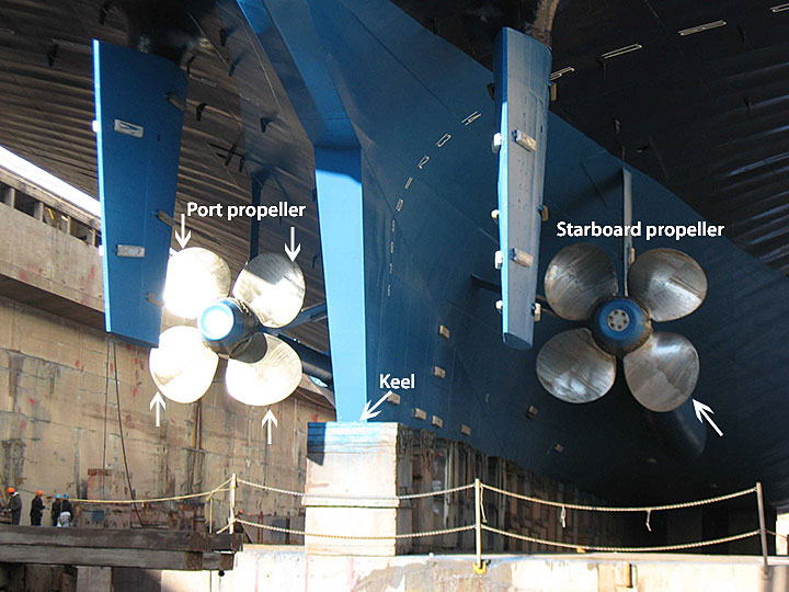 The aftermost part of the vessel's keel was scratched as a result of the grounding, and 1 of the blades on the starboard propeller was bent forward. The 4 port propeller blade tips were all damaged and required smoothing (Photo 3).