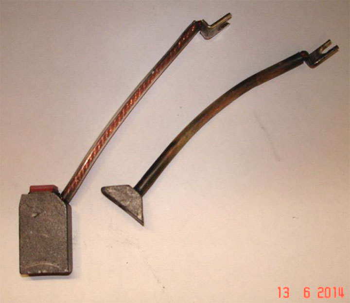 Certain types of generators are fitted with exciterFootnote 25 brushes, which are used to excite the rotor and produce alternating current. Each main generator on the Princess of Acadia was fitted with 2 pairs of excitation brushes. The brushes were made of graphite with a Shore hardness rating of 15.Footnote 26 Each brush fits into a metal brush holder with a spring that forces the brush to make contact with the rotor.