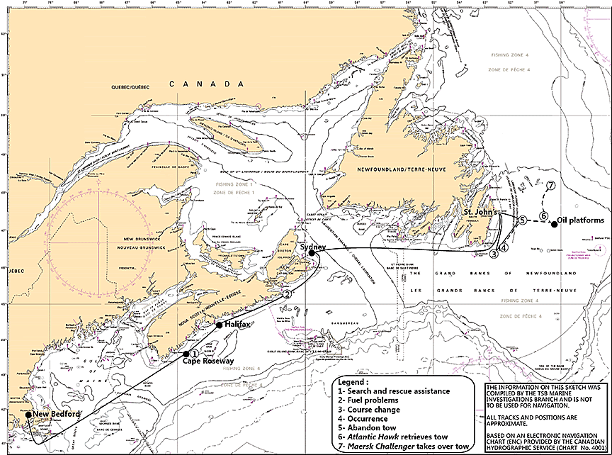 On 03 December, the tug departed Halifax for St. John's. However, when the tug was 12 nm off Cape Canso, NS, it encountered fuel filter problems with the auxiliary generator and altered course to Sydney, NS (Appendix A). On 04 December, the tug arrived in Sydney where the crew resolved the fuel filter issues. Four days later, the tug continued on its voyage to St. John's.