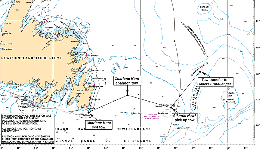 On 23 January at approximately noon, the Charlene Hunt departed St. John's harbour towing the Lyubov Orlova. The relief master, the CE, the assistant engineer, and 2 crew members were on board. At approximately 1300, the crew released the assist tug and paid out the tow line. The tug and tow then travelled in a southerly direction for approximately 18 hours, until the master changed course 50° to starboard. After the course change, the tug began travelling directly into winds estimated at 40 knots and seas of 5 to 6 m. The master reduced thetug's speedand travelled 15 nm over the next 9 hours. The heavy weather persisted and, at approximately 1445 on 24 January, the towing arrangement between the Charlene Hunt and the Lyubov Orlova failed off Cape Race, NL, in position 46°30′ N, 53°04′ W (Appendix A and Appendix B).