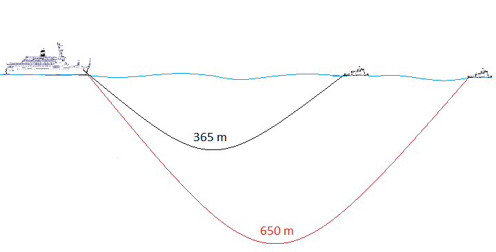 The length of the tow line is an important factor in a towing arrangement. When a tow line is sufficiently long, the weight of the tow line will cause catenary (sag) in the tow line between the tug and the tow. The catenary acts as a spring and softens the shock load on the towing arrangement.