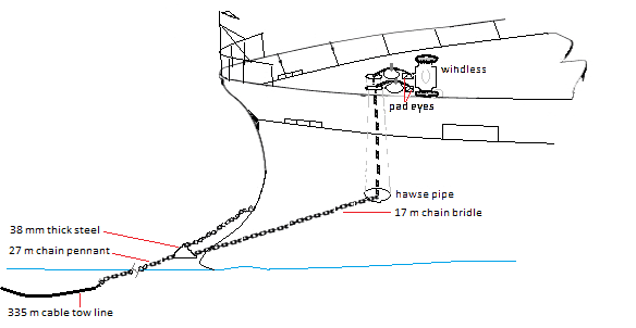The towing arrangement in this occurrence had been constructed mostly using materials salvaged from the Lyubov Orlova. The crew selected pieces of used anchor chain with the least wear to construct 2 towing bridles, each long enough to clear the vessel's bulbous bow (Figure 1).