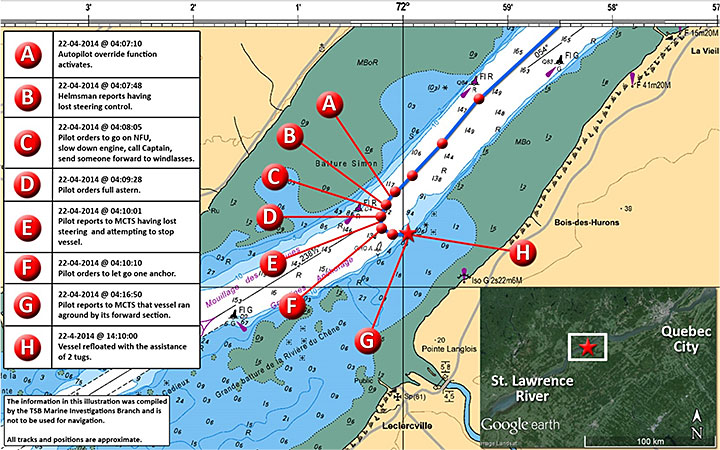 At 0410, the other pilot on board reported to Marine Communications and Traffic Services (MCTS) Québec that the Halit Bey had lost steering and that they were stopping the vessel. The speed over ground was 5.7 knots at this time. About 10 seconds later, the pilot who was conning the vessel ordered the anchor let go and, less than 2 minutes later, ordered the engine stopped. The master confirmed at 0412 that the starboard anchor had been dropped. The autopilot override alarm, which had remained on, was reset at 0413. Within the next 3 minutes, the Halit Bey exited the navigational channel and ran aground by its forward section.