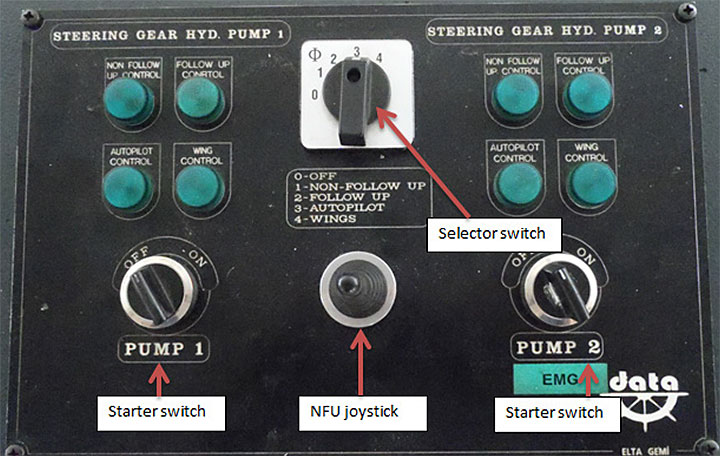 On the centre control panel, in addition to the starter switches for the 2 steering gear pumps, there is a single selector switch to toggle between 5 different steering gear system modes: (0) OFF, (1) NON-FOLLOW UP, (2) FOLLOW UP, (3) AUTOPILOT, and (4) WINGS (Photo 3).