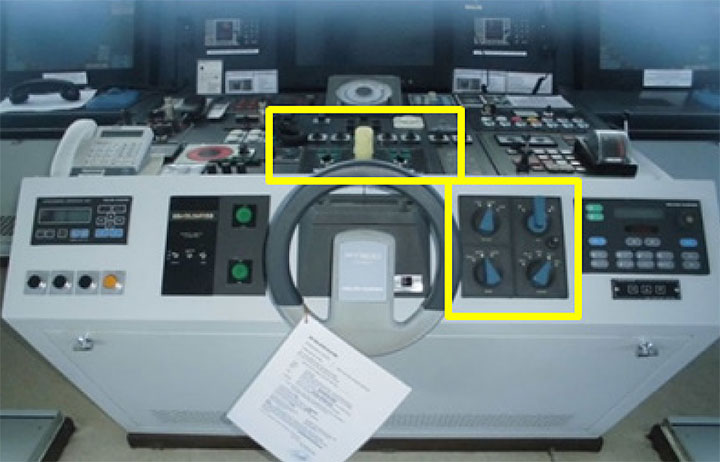 The Halit Bey was fitted with port and starboard wing consoles that each had 2 NFU steering controls (Photo 5). The top tiller switch, labelled “NFU,” could be activated from the right-hand control panel, while the lower joystick, labelled “STEERING CONTROL,” could be activated from the centre control panel. There were no labels to indicate which steering control was connected to which control panel.