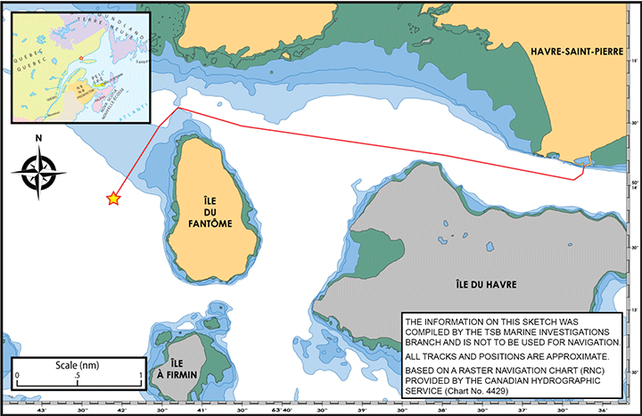 After the vessel passed the northwest point of Île du Fantôme (Appendix A), the master altered course, heading south for approximately 0.8 nautical miles (nm), at which time the vessel's engine power unexpectedly dropped. The master pushed the throttle control further forward to resume speed, and the engine power increased. However, shortly afterward, the engine power began to decrease again until the engine stopped.