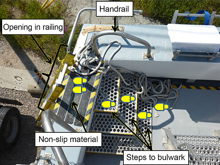 La Relève II was equipped with 1 embarkation station, on the aft starboard side (Appendix B). The station has 3 steps up to the bulwark, which is covered with a non-slip material. Beside the steps is a handrail, and along the bulwark is a railing with an opening to allow passengers to board the life rafts.