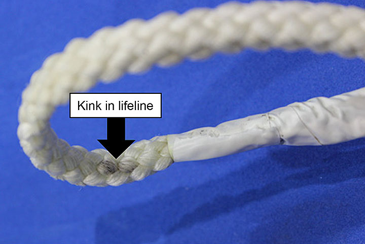 Aside from the areas around the inflation valves, the outer surface of the buoyancy tubes showed no signs of fraying, abrasion, cuts, or other pre-existing damage. The buoyancy tube material was tested for static tensile strength and met the current International Maritime Organization (IMO) specifications.Footnote 9 However, kinks in the lifeline near the inflation valves were observed on both life rafts (Appendix D). These kinks were permanent, meaning that, even after the lifeline was straightened and released, the kink reappeared in the same location. The painters and boarding ladders did not have kinks or show other signs of entanglement.
