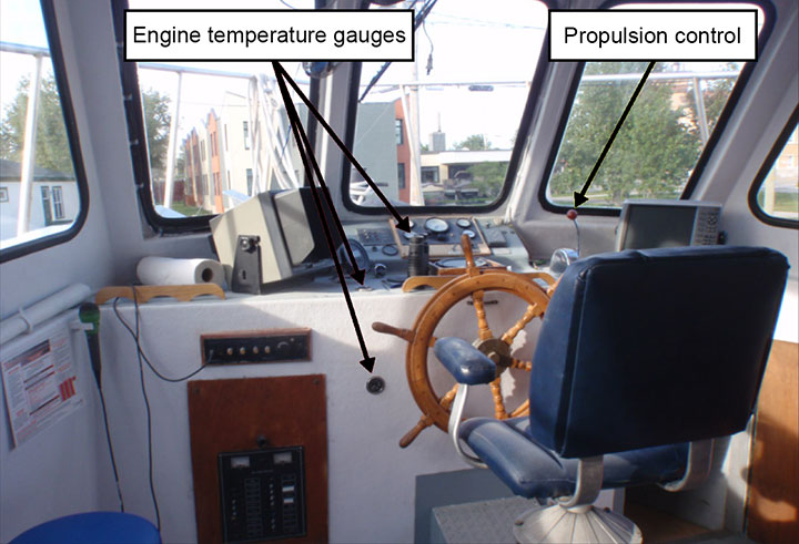 The navigation console includes a magnetic compass, radar, and a very high frequency (VHF) radiotelephone. The engine panel, situated in front of the conning position, includes various indicators for engine parameters (e.g., oil, voltage, revolutions per minute, engine temperature). There are 3 engine temperature gauges on the navigation console: 1 on the engine panel, 1 located to the left of the helm, and 1 located at knee height (Photo 2). These gauges indicate the engine coolant temperature. The console also includes a fire detection system consisting of a visual and audible alarm that is activated by a heat detector located in the engine compartment. The detector was installed on the after bulkhead of the engine compartment, which was as far from the engine as possible.Footnote 1 The propulsion control is located to the right of the engine panel.