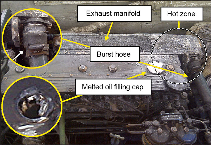 - The damaged hose and crack in the manifold directed the hot exhaust gases onto the underside of the engine compartment cover, damaging the insulation and exposing the layer of polyurethane foam.