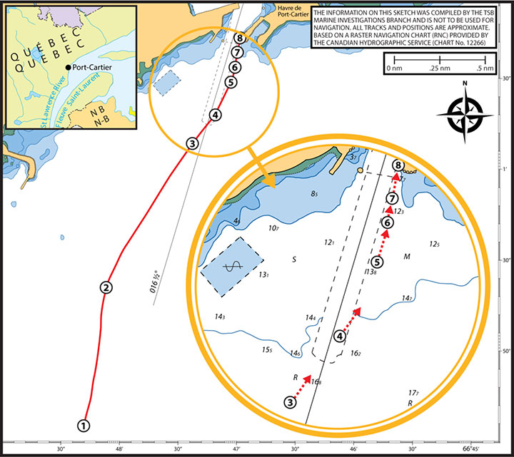 After taking over the con, the pilot navigated primarily by using visual cues to align the vessel on the recommended track, which was indicated by range lights. The pilot also visually referenced the cribs at the entrance to the harbour. Shortly after the tugs made fast, with the Vachon secured forward and the Brochu aft, the vessels advanced toward the harbour entrance, but were set east of the recommended track by the influence of the tidal current.
