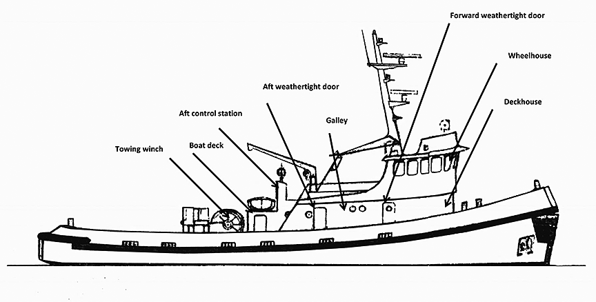 The Jose Narvaez is a single-screw, steel-hulled tug of closed construction. The weather deck comprises the main working deck (aft) fitted with a single-drum towing winch. The winch has 1 local and 2 remote emergency release stations. An enclosed deckhouse is forward of the winch and it comprises the galley and master's cabin (accessed from the forward weathertight doors on the port and starboard sides) (Appendix A). Below the main deck level, forward of the weathertight doors, are the cabins for the chief engineer, mate, and 2 deckhands.