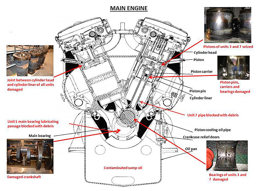 The contamination of the oil also resulted in loss of lubrication and piston cooling, and cylinder units 3 and 7 overheated. This overheating damaged the rubber seal between the cylinder head and cylinder liner, causing the cylinder cooling water to leak into the main engine crankcase. This leakage, in turn, depleted the water level from the other cylinders, which exacerbated the overheating of the rest of the engine, eventually leading to its seizure and the loss of propulsion.