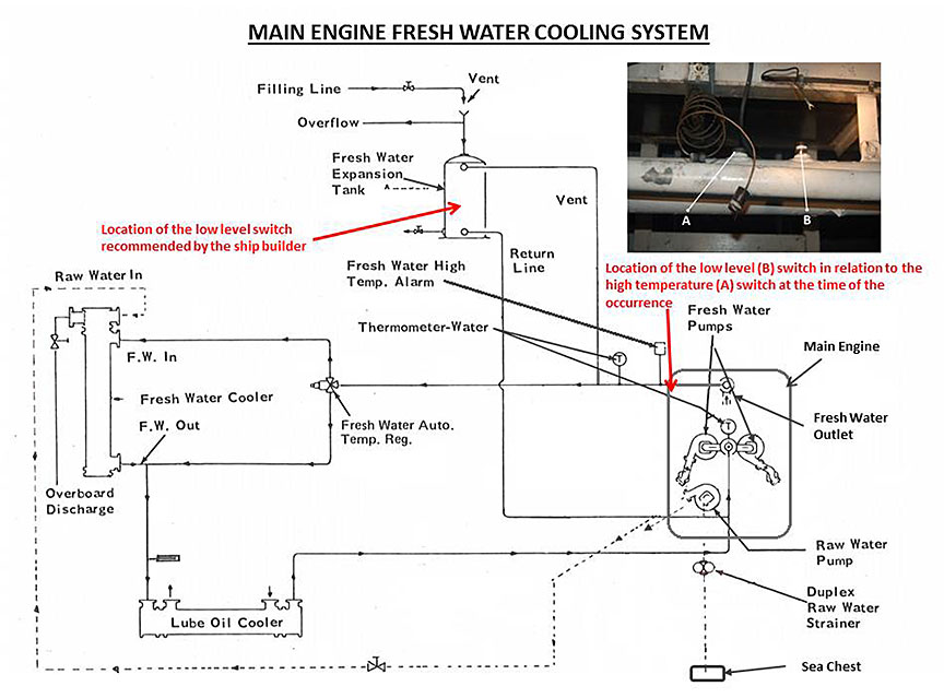In this occurrence, the low level alarm switch was fitted to the cylinder cooling water outlet piping. It was not fitted to the fresh water expansion tank (Appendix D), as was recommended by the vessel builder. As its position on the outlet piping was lower than the fresh water expansion tank, an alarm would not sound if the tank level dropped completely. In this case, the tank emptied out and the alarm did not sound. If it had sounded, the vessel crew could have been alerted to the significant loss of water, and would have had an earlier opportunity to take action.