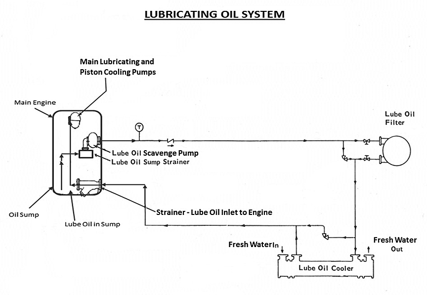 The lubrication system consists of engine-driven main lubricating and piston cooling pumps, an engine-driven scavenge pump, lube oil coolerFootnote 15 where the lubricating oil is cooled by the cylinder fresh water, and an oil sump where excess oil in the system is collected (Appendix E). A pipe is located at each cylinder to direct a stream of oil through the piston carrier to the top of the piston. Drilled oil passages in the crankshaft conduct oil to the main bearings, connecting rod bearings, and other parts of the engine. The main engine system requires approximately 990 L of Society of Automotive Engineers (SAE) 40-grade oil.