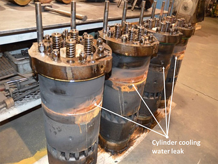 - Loss of cylinder cooling water from all units above the joint between the cylinder heads and the liners, due to gasket damage (Photo 3).
