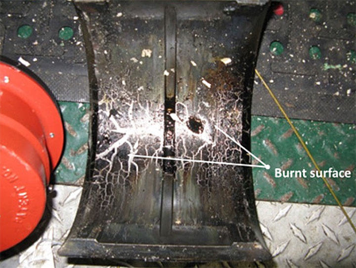 - Insert bearings had exposed bronze, and showed evidence of high heat and extreme overloading.