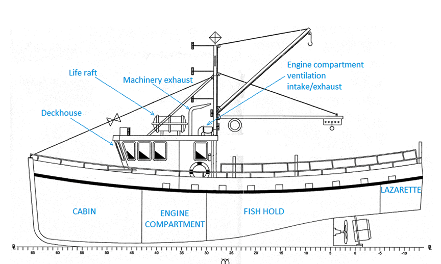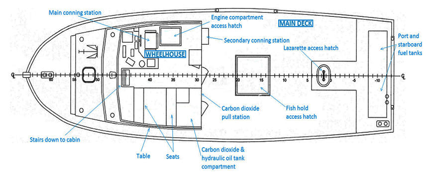 The hull was subdivided by 3 transverse bulkheads into 4 compartments from forward: a cabin, accessed by stairs descending from the deckhouse, that provided accommodations for 4 people; an engine compartment; an insulated fish hold; and a lazarette that contained the steering gear and 2 diesel fuel tanks that supplied the engine compartment machinery (Appendix A).