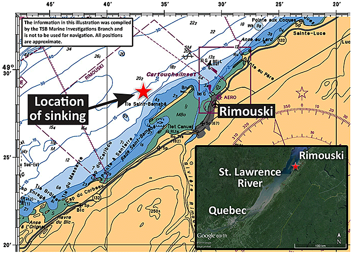 In the early morning of 28 April, the weather was overcast with periods of rain. At the time of the occurrence, visibility was between 8.5 nm and 9.0 nm, with fog having recently dissipated. The wind was from the northeast at 10 to 15 knots, and the air temperature was 3 °C. The seas were moderate, between 1.2 metres and 1.5 metres. The predicted low tide for Rimouski was at 0403, and sunrise was at 0520.