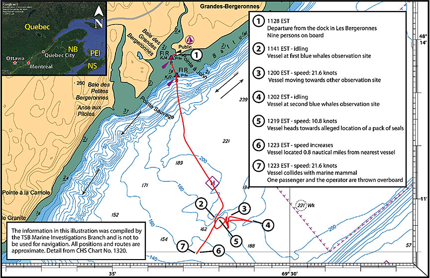 At 1219, the operator left the observation zone and piloted the Aventure 6 toward Buoy S3, located off Tadoussac, Quebec, 5.3 nm to the southwest, because a herd of seals had been reported in that area. The vessel departed at a speed of 11.88 knots.Footnote 4 As the distance to the nearest vessel was 0.8 nm, the operator began to increase speed while standing behind the helm. The water depth was about 150 m. At this time, some passengers observed a whale breaking the water's surface about 100 m ahead and crossing the bow of the vessel, moving from port to starboard. None of the passengers informed the operator of this observation.