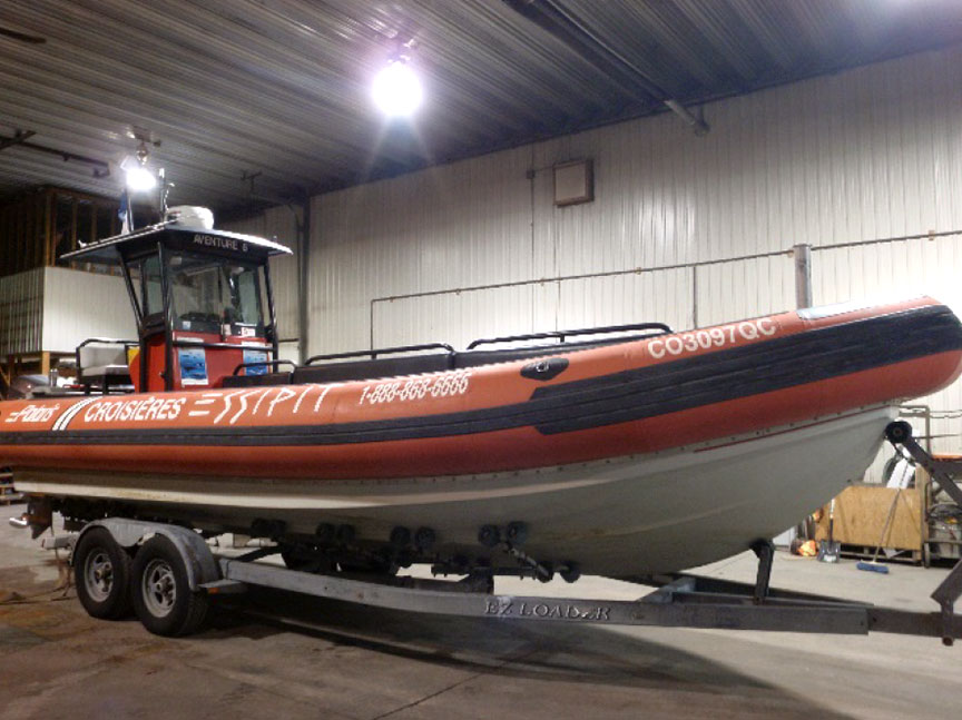 The C03097QC (Aventure 6) is a rigid-hull inflatable passenger boat designed to carry a maximum capacity of 9500 pounds, or 28 persons. The hull and deck of the vessel are made of fibreglass while the all-around, 60 cm (24-inch) diameter pneumatic tube is made of mixed synthetic materials and is segregated into 5 independent air chambers.