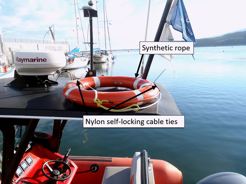 In the past, the Aventure 6 and its sister vessels had lost a few lifebuoys at sea; the yacht‑type holding straps used to secure the lifebuoys to the vessel were not suitable for withstanding the winds, vibrations, and bouncing that occur during excursions at sea. In order to prevent any further loss of lifebuoys, the stowage arrangements throughout the fleet were modified to include a combination of nylon self-locking cable ties and synthetic rope (Figure 3).