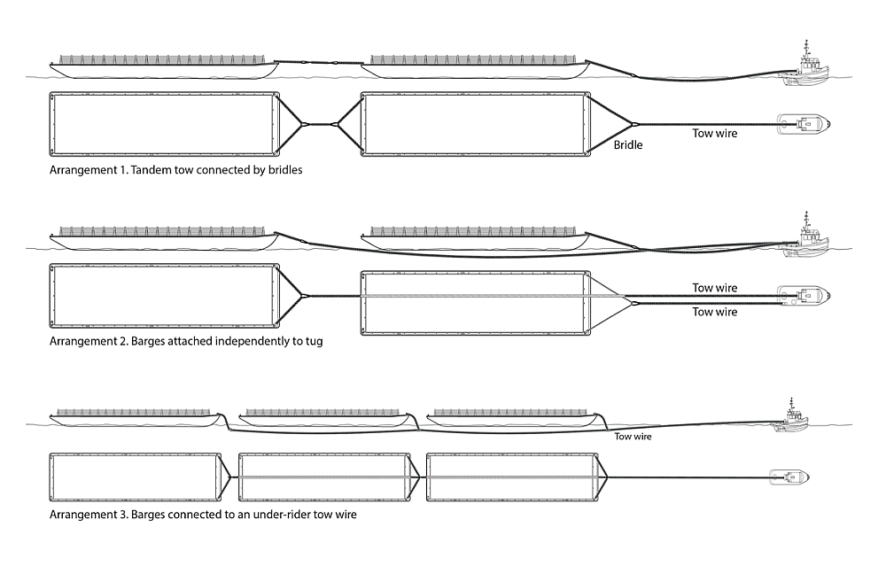 A number of arrangements can be employed when a tug is towing multiple barges in exposed waters; see Appendix C for 3 examples.