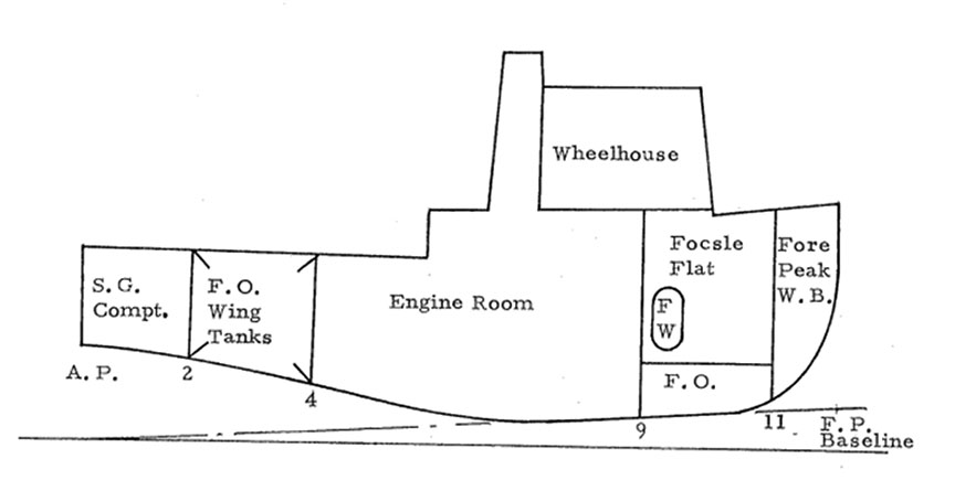 The Albern was a single-screw, steel-hulled, pointed bow tug with a rounded stern (Figure 1). The main deck had a bulwark, and the bow had fenders to protect it during operations such as pushing and log yarding. An aluminum wheelhouse was located on the fore part of the main deck, and there was a flying bridge atop the wheelhouse. Below the main deck were 3 transverse bulkheads that created 4 compartments (from forward): the forepeak, the forecastle, the engine room, and the lazarette.