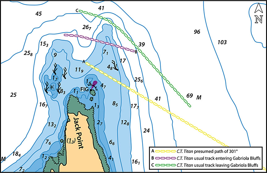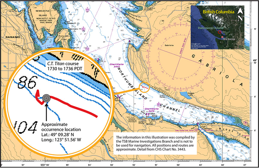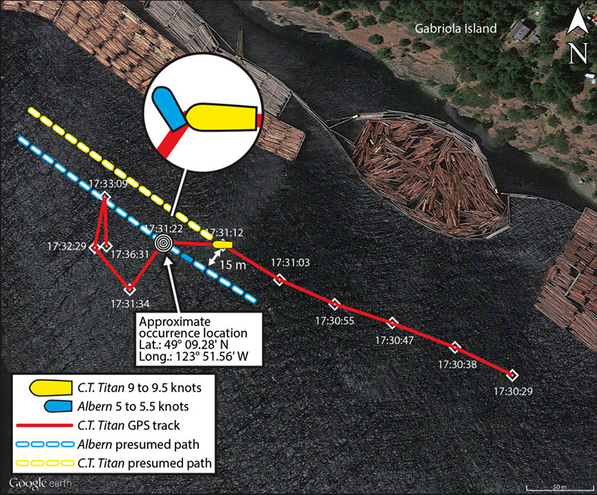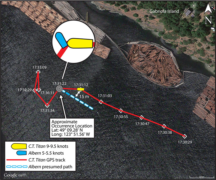 At approximately 1729, the C.T. Titan, with 3 people on board, also departed the log yard, heading towards Nanaimo Harbour for a crew change. The C.T. Titan travelled at a speed of about 9.5 knotsFootnote 4 on a heading of 296°T. The C.T. Titan travelled parallel to the Albern's course, about 15 m away from its starboard side and about 22 m behind its stern. The master of the C.T. Titan navigated from the flying bridge, and used the jogFootnote 5 to maintain a relatively straight course, averaging 292°T.