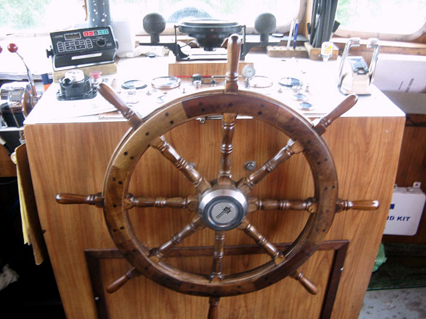 An aluminum wheelhouse is located on the fore part of the main deck, and is accessible from the main deck through weathertight doors located on its port and starboard sides. The wheelhouse is equipped with a propulsion control unit, steering controls, radar, an autopilot, an electronic chart plotter, a global positioning system, and 2 VHF radiotelephones with digital selective calling.