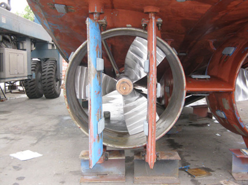 The steering gear system consists of 2 sets of rudders, which are located immediately aft of each propeller (Figure 3). All 4 rudders operate synchronously; for example, moving the steering control to port moves all 4 rudders to the port side.
