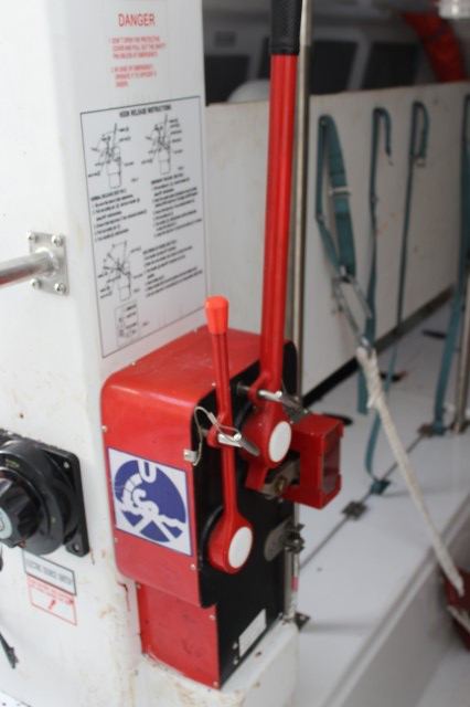 A cable connects the primary on- or off- load release handle to a locking plate in each of the lifeboat’s release hooks. The on- or off-load release mechanism operator operates this handle, which raises or lowers the locking plate that secures the hook tail within each fore and aft release hook.
