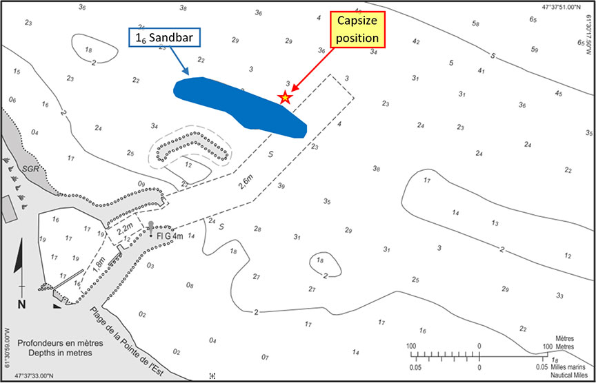 Around 1430, the crew finished hauling traps at the Rochers aux Oiseaux (Bird Rocks) and proceeded toward Grosse-Île, 19 nautical miles (nm) to the southwest. The master obtained a waypoint where another fisherman had successfully crossed the sandbar a few hours earlier; he plotted this waypoint and proceeded toward it.