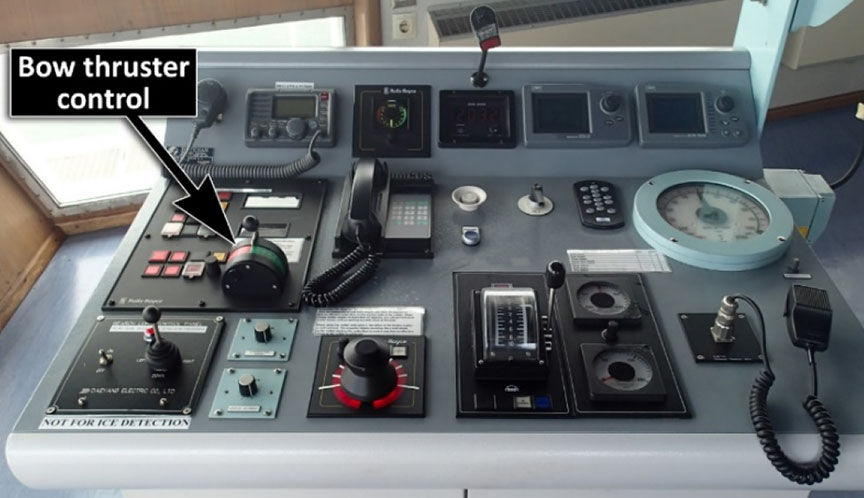 The bridge is equipped with 2 very high frequency (VHF) radiotelephones, an electronic chart display and information system (ECDIS), 2 radars, and 3 conning stations: 1 amidships, 1 port, and 1 starboard. The conning stations are fitted with controls for the main engine, the controllable pitch propeller, the bow thruster, and the steering gear (Figure 2).