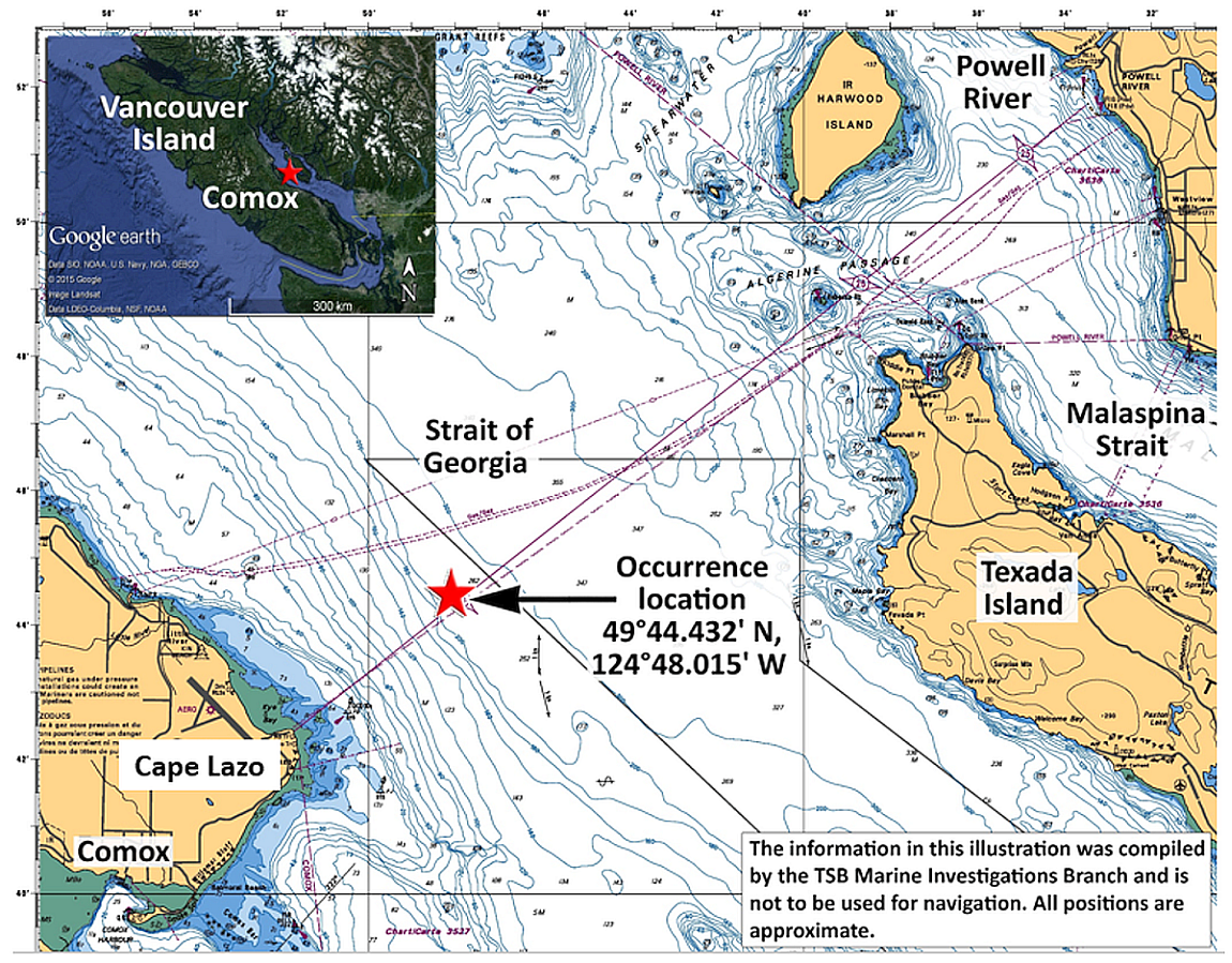 On 06 March 2017, at approximately 0600,Footnote 4 the Miss Cory departed Comox, British Columbia, with nearly full tanks of fresh water and fuel, and approximately 4 tons of ice in each forward hold. The vessel was manned by a master, an engineer, 2 deckhands, and a cook, and was headed for the fishing grounds off Cape Lazo (Appendix B). Prior to departure, the crew had replaced one of the electric pumps in the shaft tunnel. The inspection plate to the shaft tunnel located in the aft hold was left open so that the crew could monitor the pumps' performance and any ingress of water into the shaft tunnel.Footnote 5