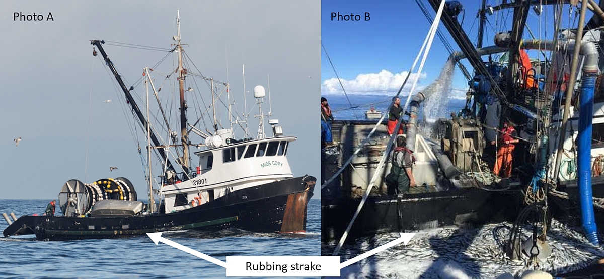 The Proud Venture then contacted the packer Pacific Joye, which was in the area; the Pacific Joye came alongside the Proud Venture at approximately 1230. The Proud Venture used its fish pump to transfer approximately 100 tons of herring, mostly from the top of the concentrated pocket of fish in the tightly pursed seine, into the Pacific Joye. At approximately 1345, after the Proud Venture finished loading the Pacific Joye, the Miss Cory developed a noticeable starboard list from the weight of the fish in the seine. To stabilize the vessel and reduce the list, approximately 40 tons of fish were loaded into the forward holds of the vessel, which submerged the vessel's rubbing strake (Figure 3). No other packing vessels were immediately available to assist the Miss Cory. At approximately 1500, the crew started transferring fish into the Proud Venture. By this time, the fish had settled to the bottom of the purse.Footnote 9 A section of hose was added to the pump and lowered to the bottom of the purse to access the fish.