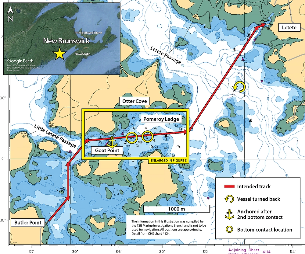 CTL had developed a detailed passage plan that complements the route displayed on each vessel’s ECS. For each leg of the route, information about parallel indexing,Footnote 7 alteration points, direction of tidal current, meeting areas, and areas to be avoided is provided. For the route leg between Goat Point and Pomeroy Ledge, the passage plan states that “shoal sounding area near the isolated danger buoys, should be avoided when water depths under the drives do not allow 1–meter [sic] clearance.”Footnote 8