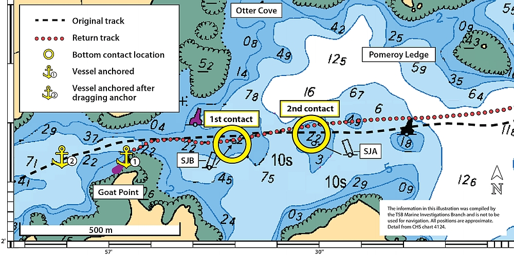 At 2047, the vessel began to drag anchor, drifting through the channel north of Goat Point, and then stopped dragging anchor at approximately 200 m west of the Goat Point light tower.